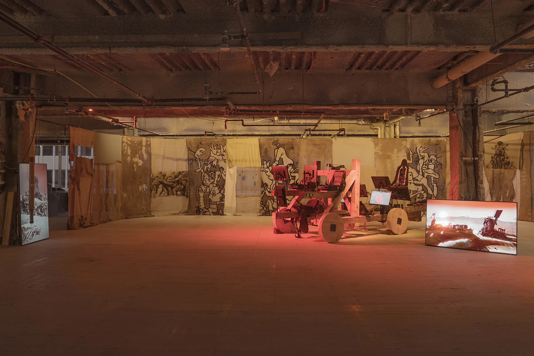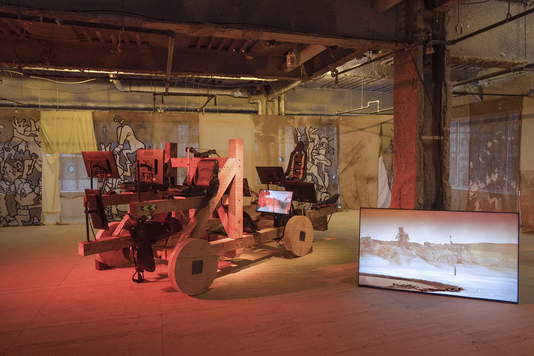 JW: For Feral Metaverse with its custom medieval catapult rig and eight-player installation—what was the collaboration structure with venues? Starting with Nagel Draxler gallery, then moving to the Group Hug exhibition at Whitney?